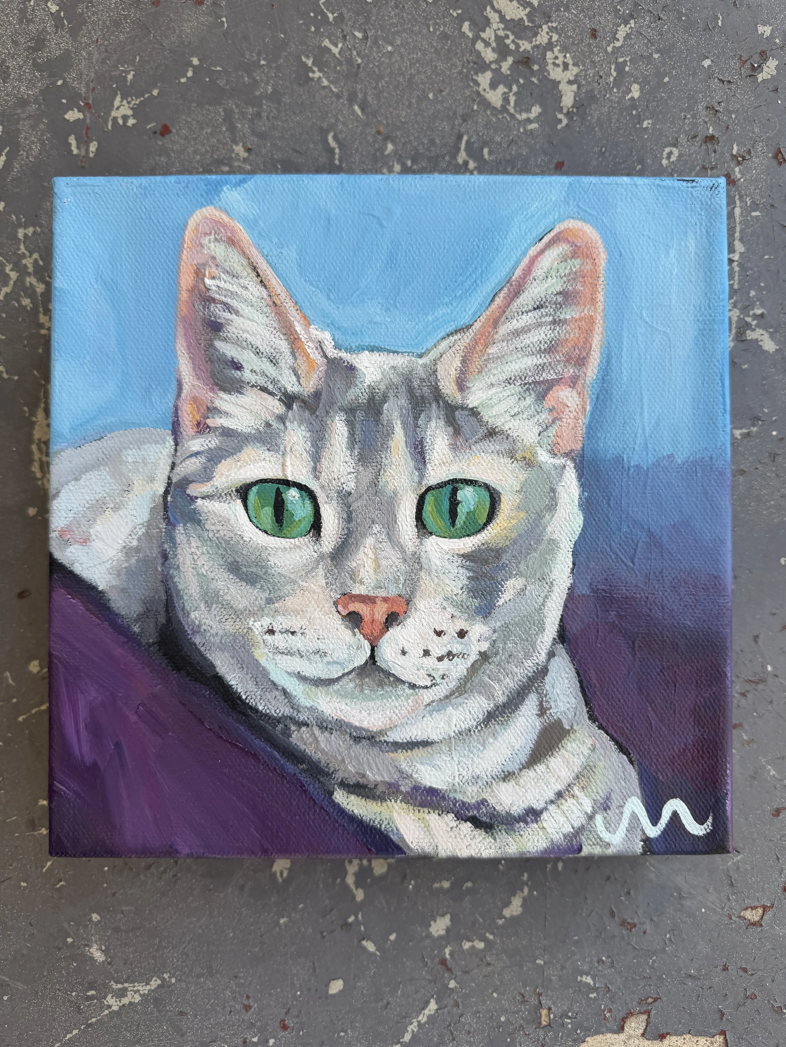 8x8 inch original acrylic painting on canvas. This was a commission for a friend. Their friend had a just lost their beloved pet and this was a very thoughtful gift for them as they were grieving their cat. Jan 7, 2025.